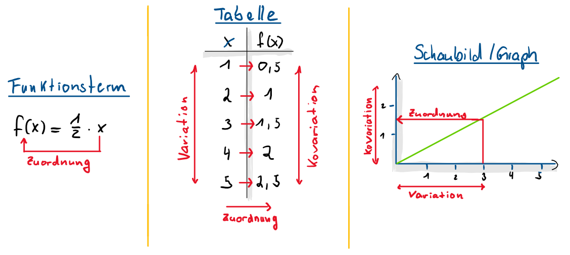 Für einen adäquaten Vorstellungsaufbau ist es zunächst wichtig, dass die Schülerinnen und Schüler gehaltvolle außer- und innermathematische Anwendungen des Funktionsbegriffs kennenlernen. Ebenso wichtig ist dabei die intensive Auseinandersetzung mit unterschiedlichen Darstellungsmöglichkeiten für Funktionen (Beschreibung in der Anwendungssituation, Wertetabelle, Schaubild, Funktionsgleichung).