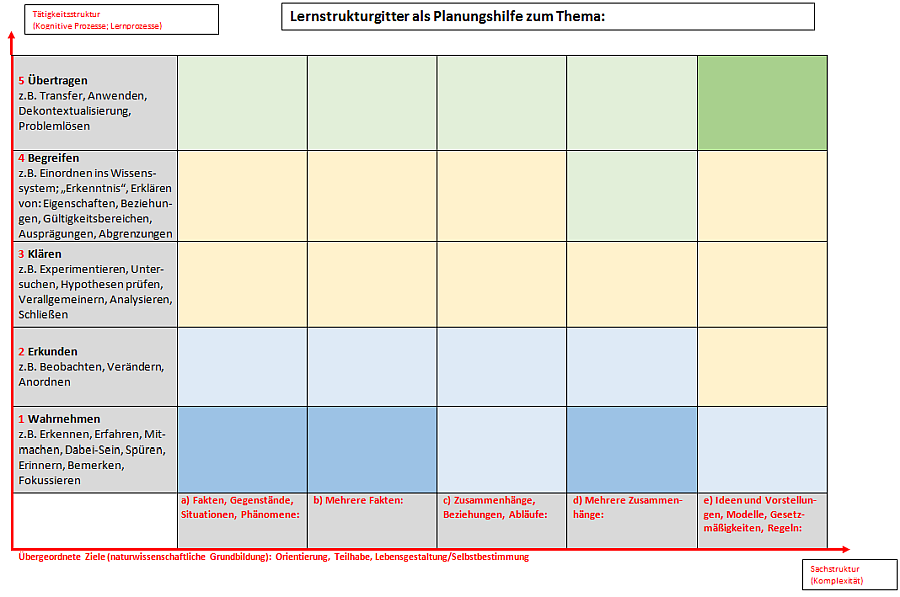 Anhand des hinterlegten exemplarisch eingefärbten Lernstrukturgitters können Sie sich zunächst einen allgemeinen Überblick über einen anzustrebenden Kompetenzaufbau entsprechend der Dimensionen Sachstruktur und Tätigkeitsstruktur verschaffen.