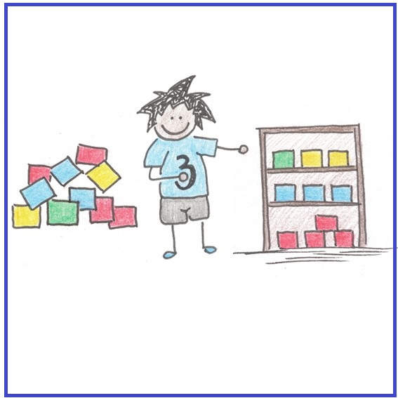 You make your room tidy; you put away things that lie around in your room. In this picture Noah is tidying up his room.